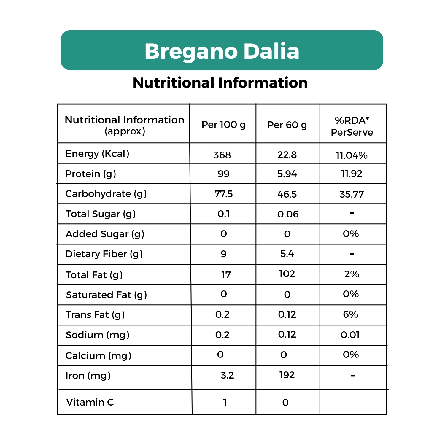 Bregano Dalia is made from premium broken wheat, rich in fibre, protein, and essential nutrients. Light, easy to digest, and naturally low in calories, it supports digestion, heart health, and women’s wellness—perfect for all ages and meal types.