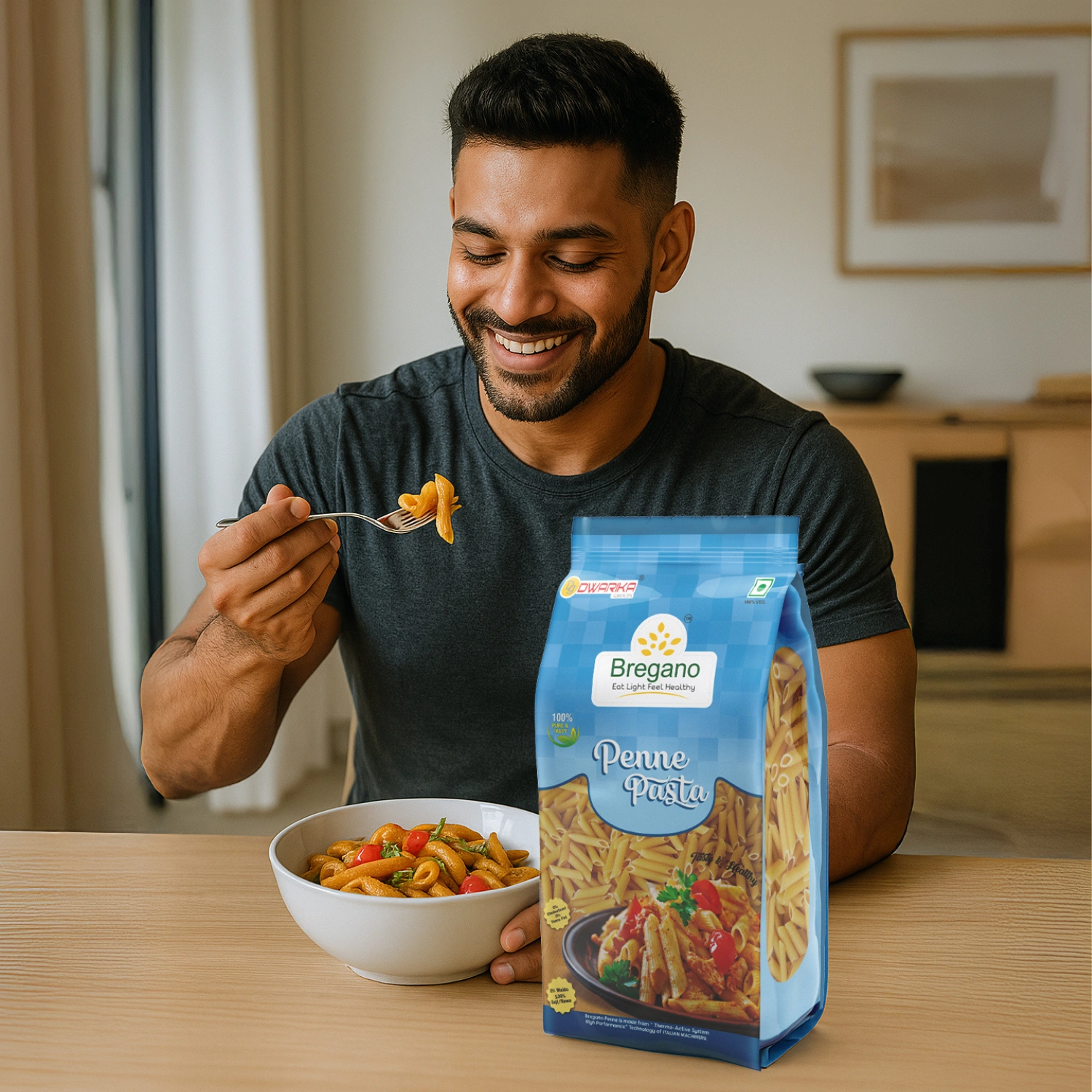 Made from premium Durum Wheat Semolina, Bregano Penne Pasta offers an authentic Italian taste with zero trans-fat and a low glycaemic index. Its tube shape captures sauces well—rich in protein, fibre, and Vitamin B for wholesome, nutritious meals.