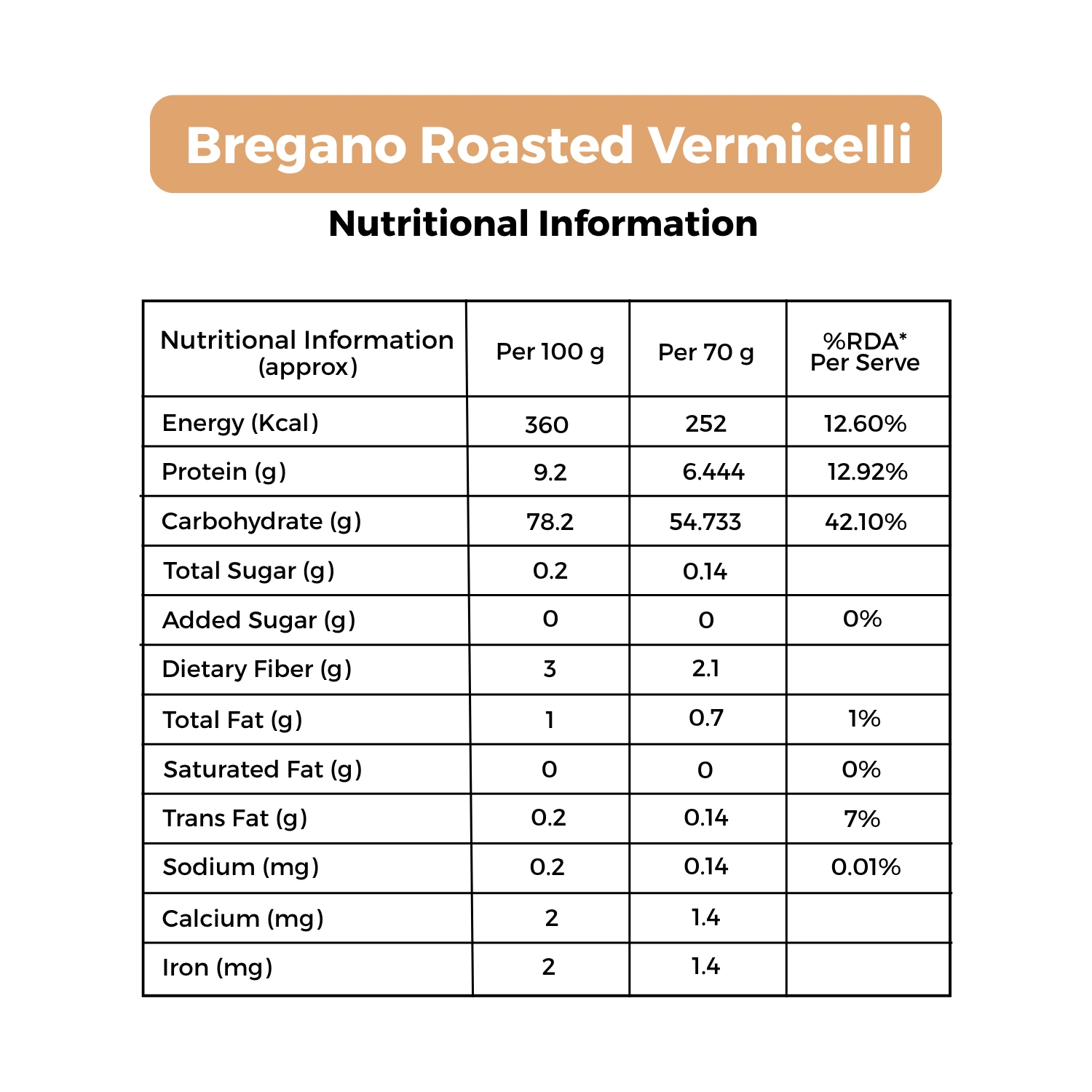 Bregano Roasted Vermicelli is made from premium hard wheat semolina and comes pre-roasted for quick, hassle-free cooking. Ideal for Upma, Kheer, or Biryani, it brings rich taste, soft texture, and wholesome nourishment—making it a convenient choice for both everyday meals and festive recipes.